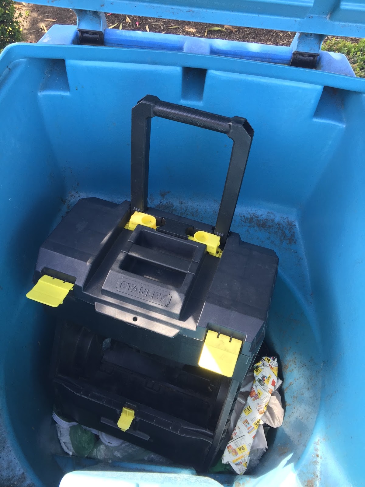 My Stanley Tool cart spent its life helping me sharpen knives by holding the battery and the power inverter that I needed for my solar power system. This is how I reward my loyal tool — abandoned in a recycling bin. So sad...